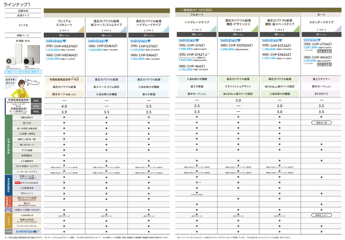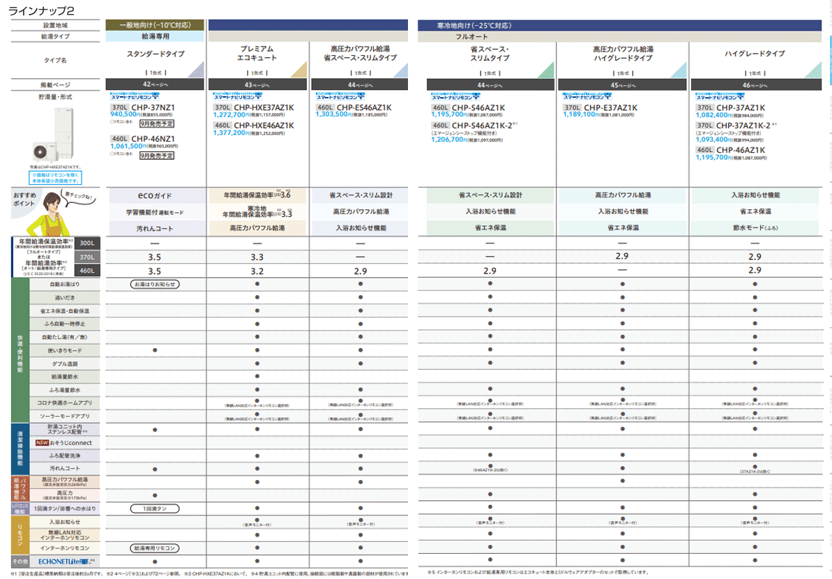 ※年間給湯保温効率(JIS)及び年間給湯効率(JIS)は、「JIS C 9220:2018」に基づき、ヒートポンプ給湯機を運転した時の単位消費電力量あたりの給湯熱量及び保温熱量を表したものです。ふろ保温機能のあるものは年間給湯保温効率(JIS)とし、ふろ保温機能のないものは年間給湯効率(JIS)とし、以下の式で求められます。年間給湯保温効率(JIS)=1年間で使用する給湯とふろ保温に係る熱量÷1年間に必要な消費電力量 年間給湯効率(JIS)=1年間に使用する給湯に係る熱量÷1年間に必要な消費電力量 地域や運転モードの設定、ご使用状況等により異なります。