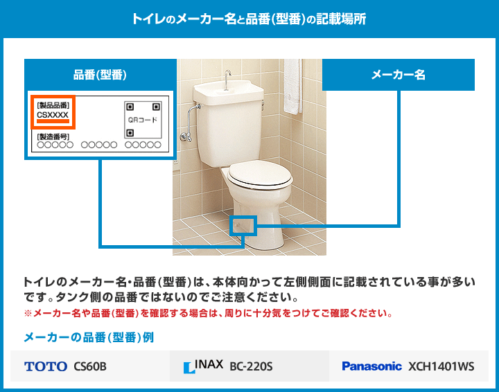 正面向かって左側面下部に記載がございます。「C○~」もしくは「○C~」から始まる品番です。詳しくは【トイレ:品番確認】より画像をご確認ください。